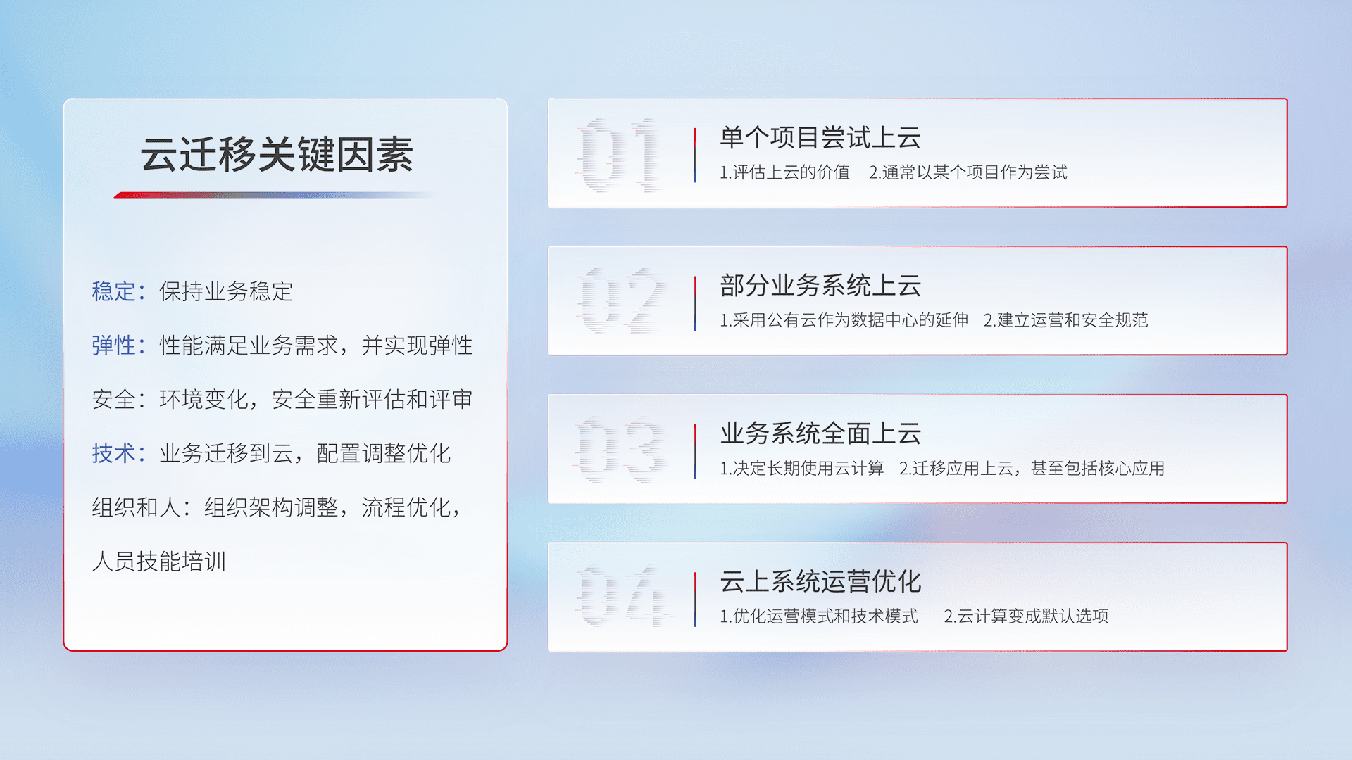 结合实际业务,,,,从规划设计、、、、云平台选型、、云原生改造、、、、数据迁移、、集成交付,,迁移全过程为客户识别最佳上云路径,,,做好风险识别管理,,,设计网络架构、、身份权限、、、安全审计合规、、、、操作审计、、、日志审计、、、、监控告警策略、、多站点容灾设计等,,对云上基础设施进行整体规划,,提升IT治理水平,,,以满足弹性、、高可用、、、、高性能的需求。。