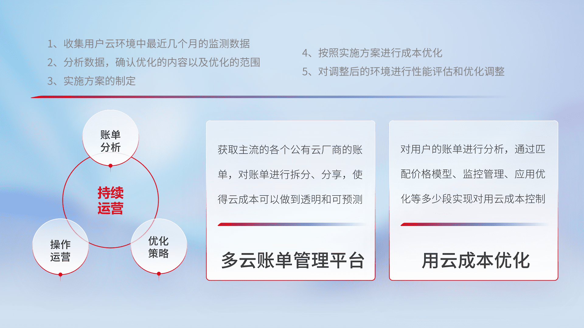 通过多云纳管,,,以统一的资源数据模型把客户的云资源进行抽象和封装,,,进而实现对多云资源的统一操作,,保障云资源管理的可靠性、、、稳定性与可用性。。量身定制化运维内容,,,,配置、、、、开发运维、、、补丁管理、、备份、、、监控、、认证和访问管理、、审计和日常巡检等,,,保障在用云过程中的可靠度,,,,稳定度以及高可用率。。。