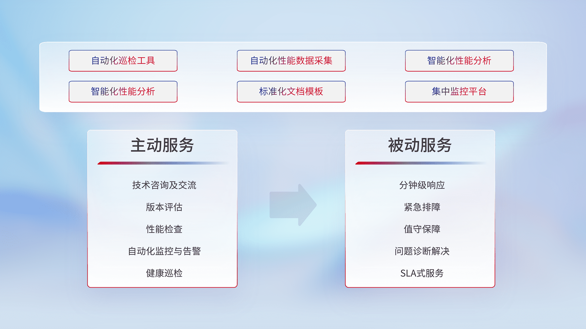 智能化工具和标准化文档,,,,保障服务质量,,,,提供主动服务(包含技术咨询、、、版本评估、、、、性能检查、、、、自动化监控与告警、、、健康巡检)和被动服务包含(分钟级响应、、、紧急排障、、值守保障、、问题诊断解决、、SLA服务)。。。。